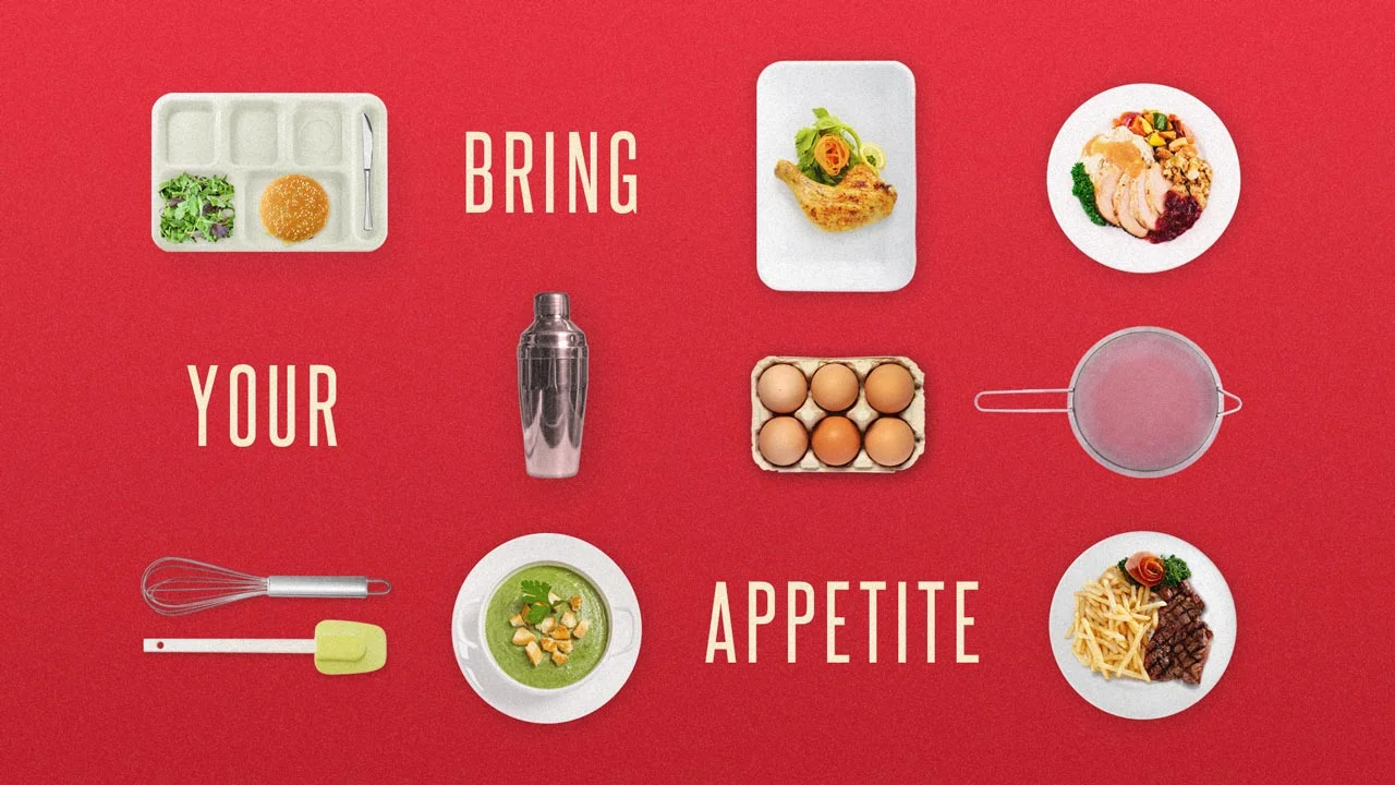 Created promo content and style guide for The Food Network's new show The Kitchen. Textured illustrations and dishes over blocks of color with subtle animation.